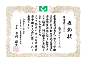 安全衛生水準の向上や快適な職場環境の推進に貢献した功績が認められ、山口県より表彰いただきました。